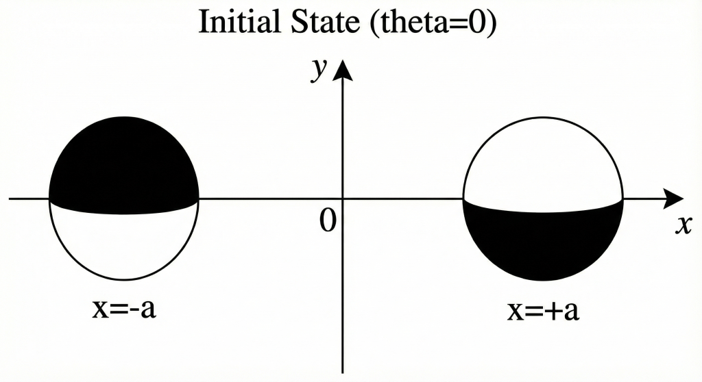 - The electron on the left (−a) has its black half facing “up” (+y).