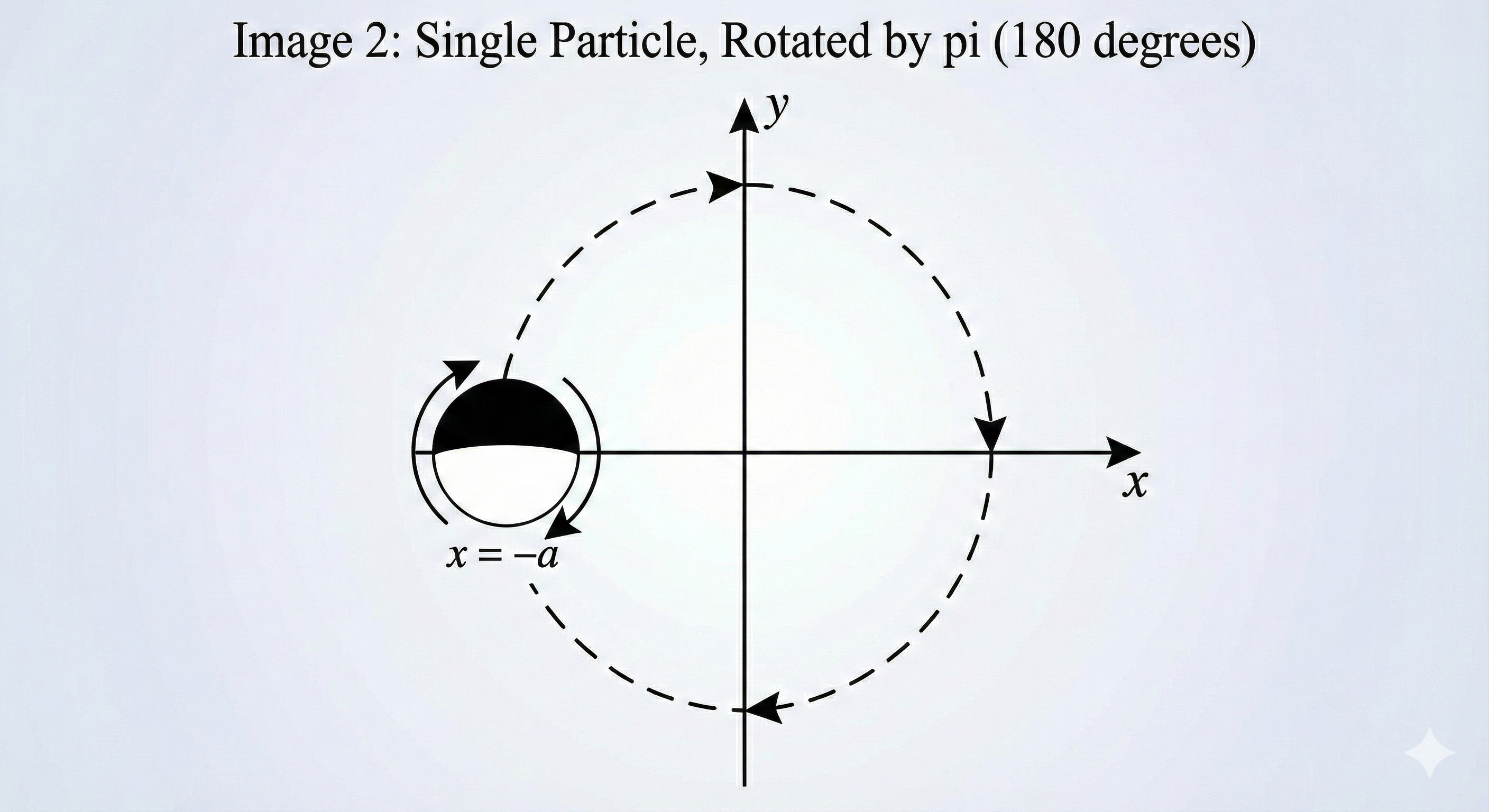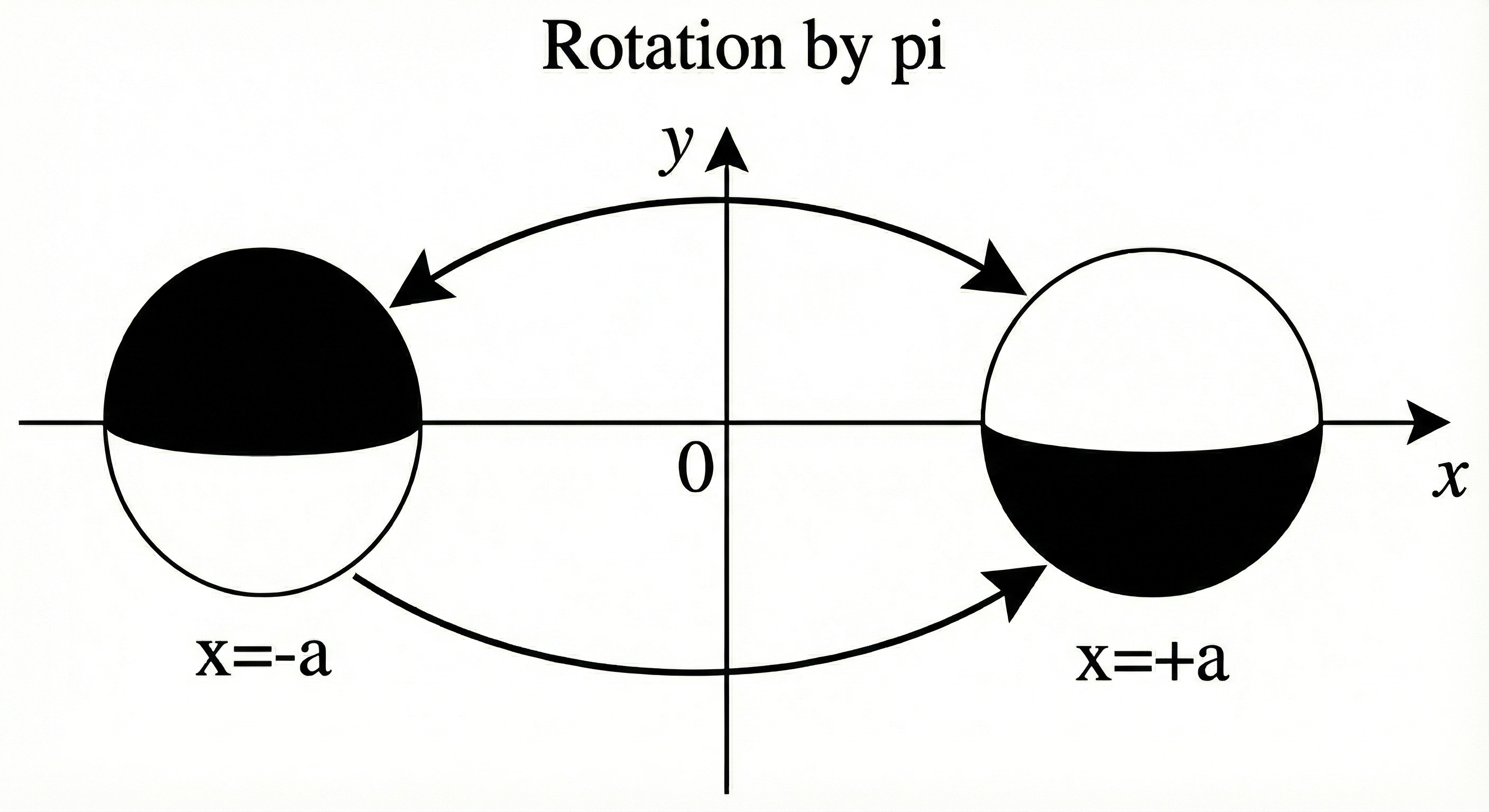 Now, what does it mean to “swap” these particles physically? It means we take the whole system and rotate it by 180 degrees (π radians) around the center point.