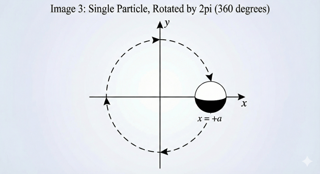 So, remember this: Rotating a spin- particle by a full circle multiplies its state-vector, i.e., its wave-function, by a factor of -1.